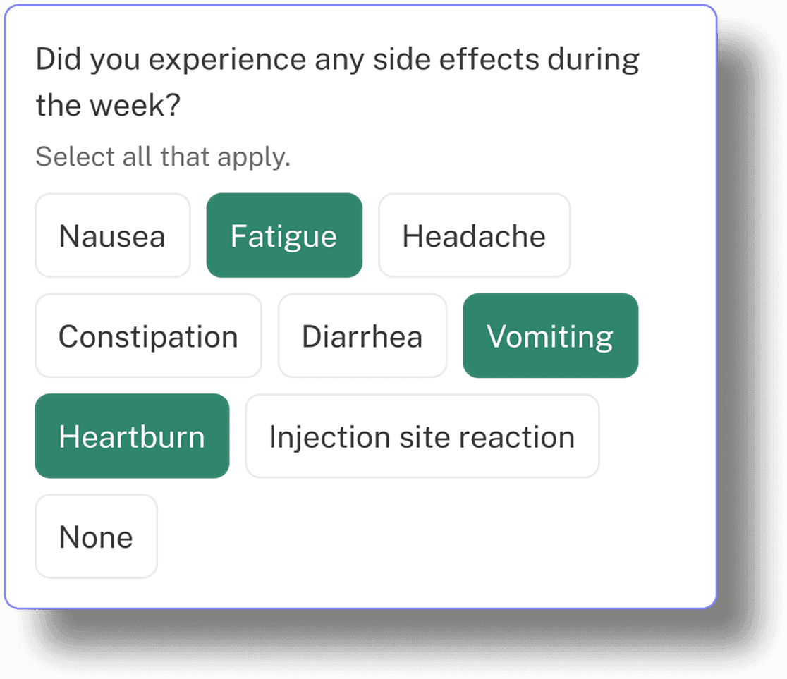 Nausea, fatigue, appetite changes. Log what you feel and how severe it is. Over time you'll see exactly how your body is adjusting and what to expect next.