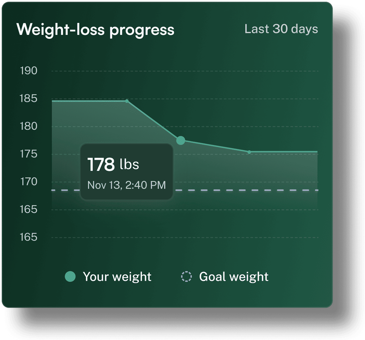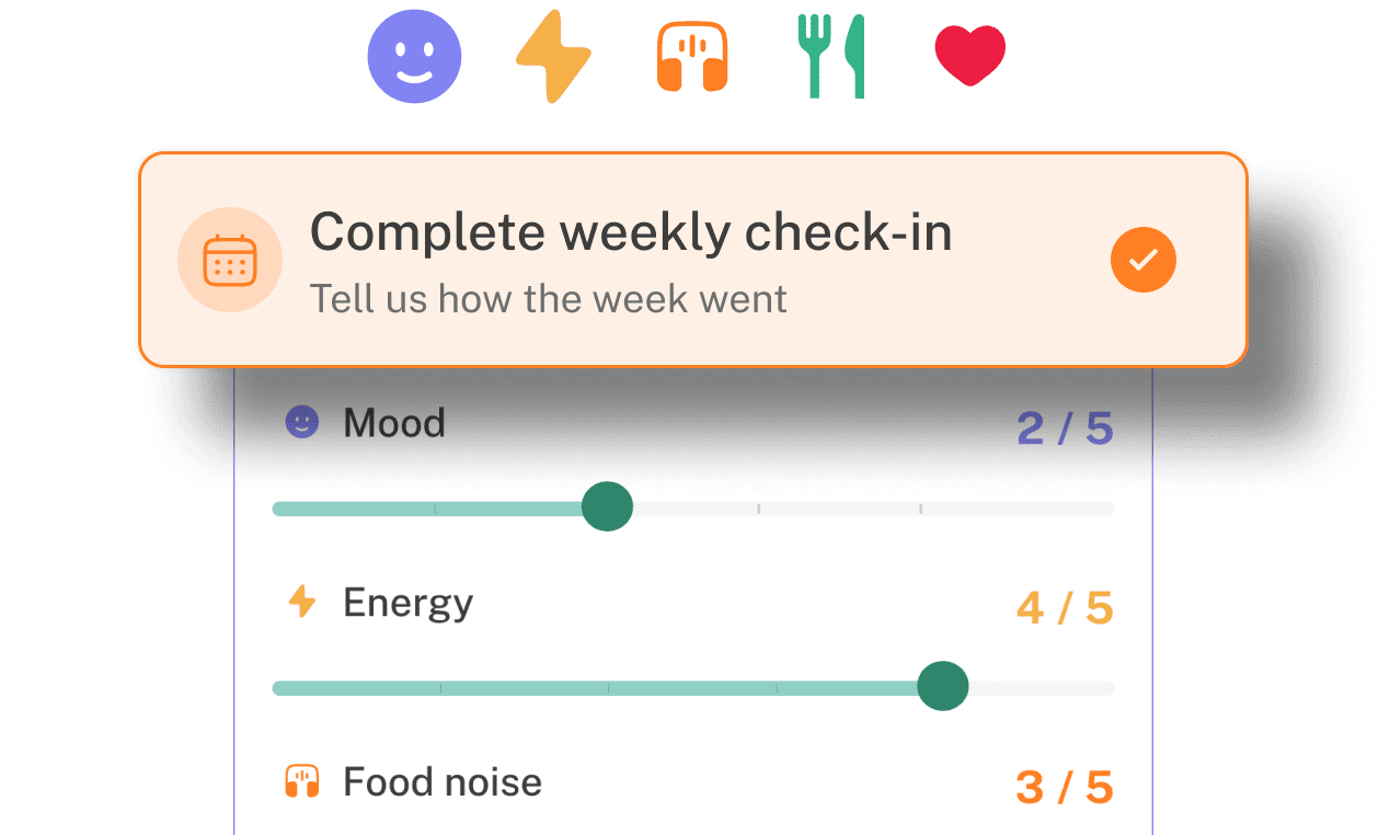 Watch your weight trend, habit streaks, and food noise patterns come together in one dashboard. No spreadsheets. No guessing. Just clear evidence that it's working.